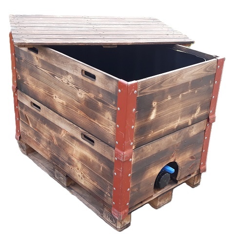 Holzfass und Deckel geflammt offen 600 l IBC NEU SCHWARZ (Trinkwasser) auf Holzpalette