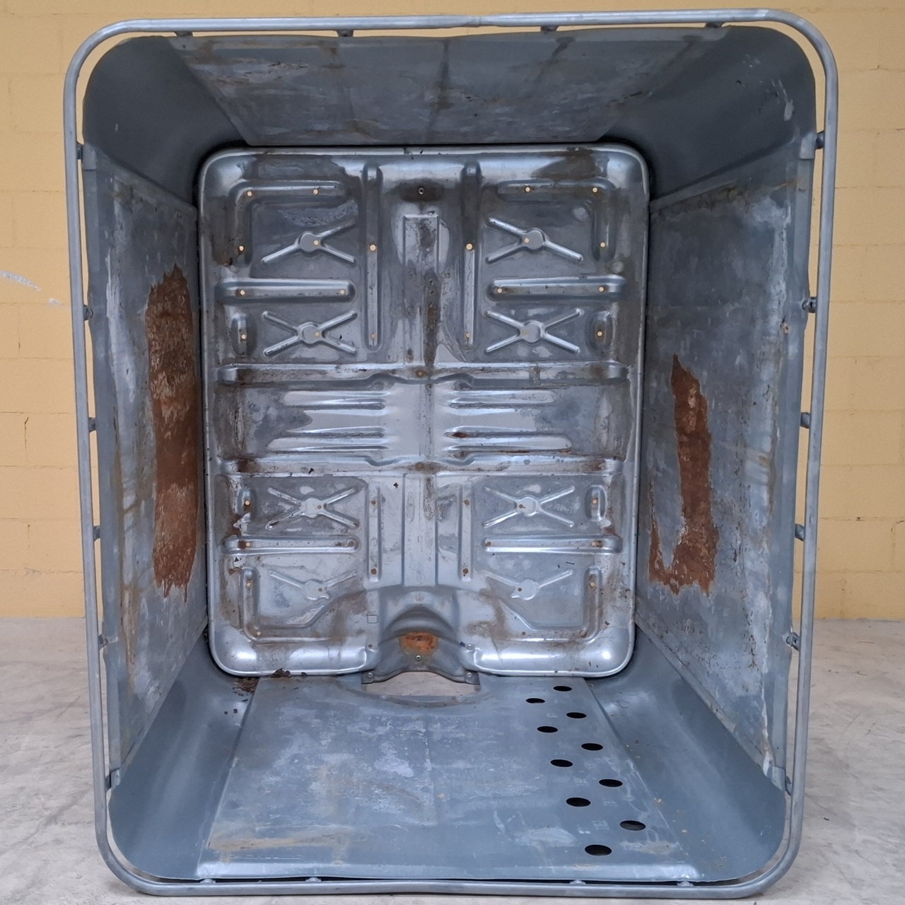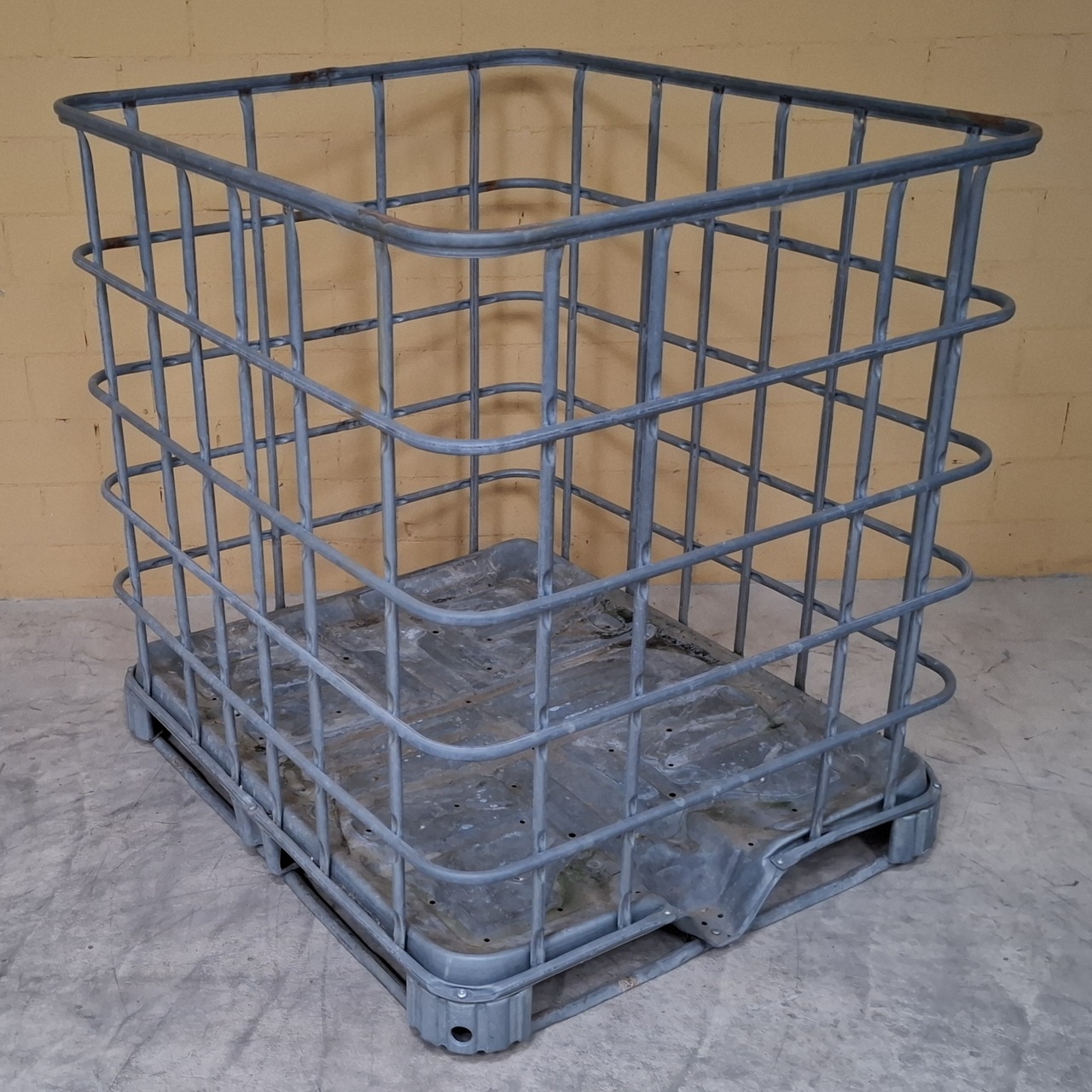 Breite IBC Gitterbox auf verzinkter Metallpalette gebraucht, eignet sich mit Stahlblech-Verkleidung auch als Mehrweg-Abfallbehälter (aus der Lebensmittelbranche, das bekannte Zitronensaft-Konzentrat mit Flügel)